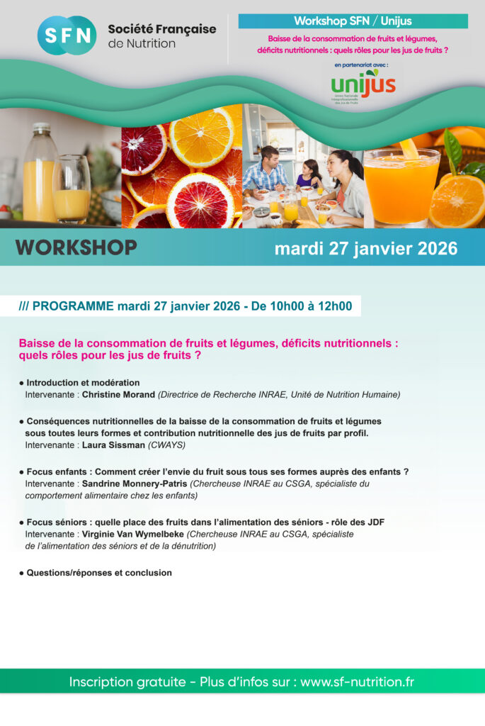 Workshop SFN X UNIJUS “Baisse de la consommation de fruits et légumes, déficits nutritionnels : quels rôles pour les jus de fruits ? / Mardi 27 Janvier 2026
