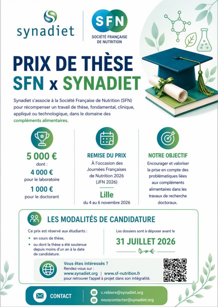 La Société Française de Nutrition (SFN) et Synadiet (Syndicat National des Compléments Alimentaires) s’associent pour récompenser un travail de Thèse de Doctorat, fondamental, clinique ou en santé publique, dans le domaine des compléments alimentaires en décernant un Prix de Thèse d’un montant de 5 000 €.